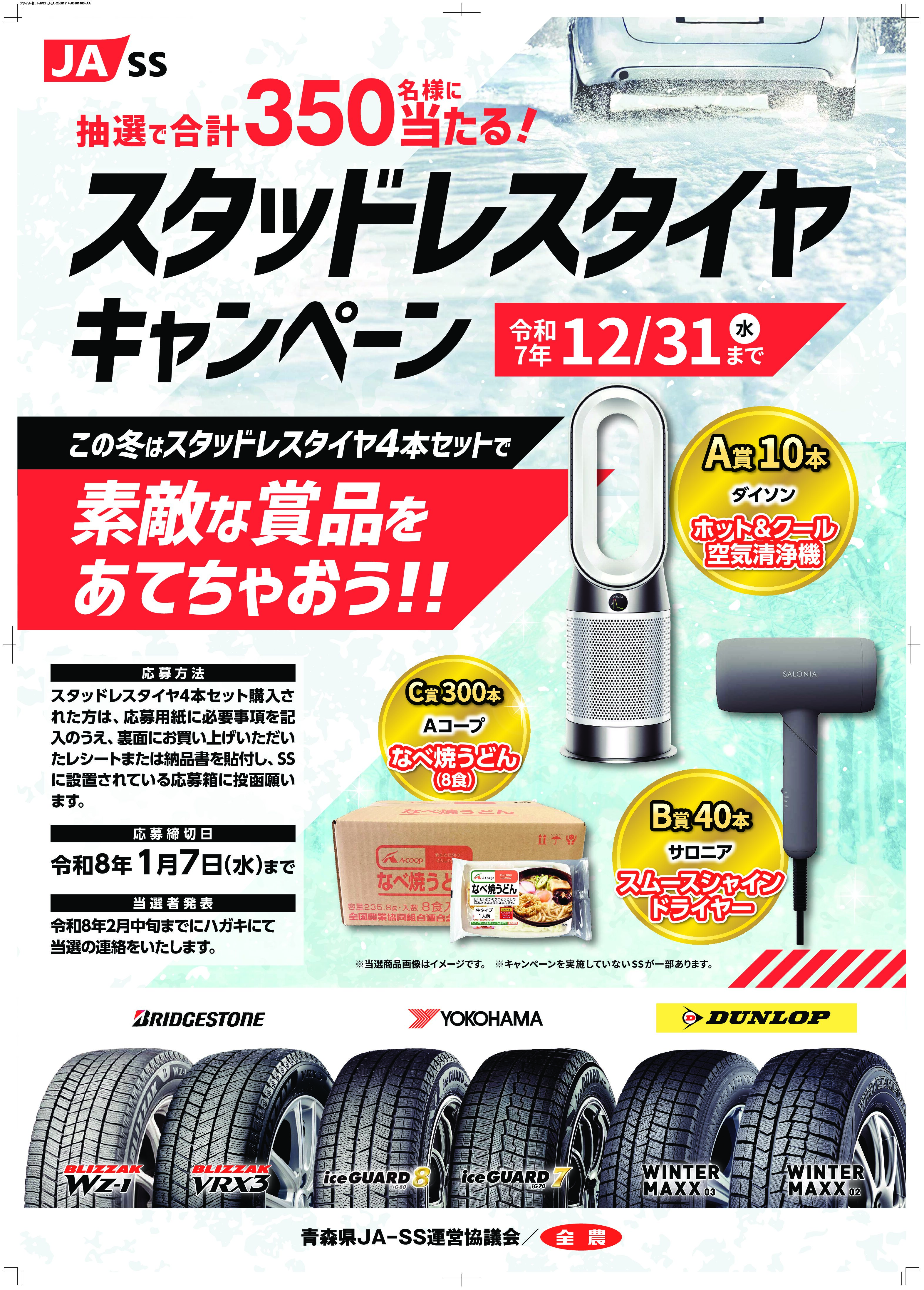 お知らせ 【12/31まで】豪華景品が当たる!スタッドレスタイヤキャンペーン開催! 2025.09.24 ☆キャンペーン☆ 令和7年12月31日までにJA-SSでスタッドレスタイヤ4本を購入すると、素敵な賞品が当たるチャンス! A賞:ダイソン ホット&クール空気清浄機 10本B賞:サロニア スムースシャインドライヤー 40本C賞:Aコープ なべ焼きうどん(8食) 300本 応募締め切りは令和8年1月7日まで!奮ってご応募ください!!