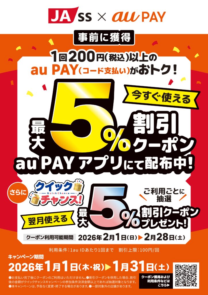 ☆キャンペーン☆ 期間中、JA-SSの対象店舗にて1回200円(税込)以上のau PAYで使える最大5%割引クーポンをau PAY アプリにて配布!クーポン配布・利用期間:2026年1…